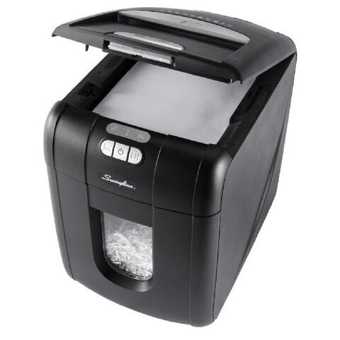 Experience the productivity of hands free shredding. The Swingline™ Stack-and-Shred™ shredder works without your supervision; just stack, shut and you're done. Stack up to 100 sheets for automatic shredding at home or in the office. Manual bypass handles 6 sheets of glossy, folded or crumpled paper.